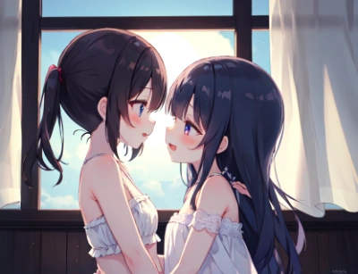 (backlighting, Yuri, close to kiss, before sex:1.2), sacred ray, striation, (silhouette:1.1), sunset light from window, undressing school uniform, classroom, symmetric, from side, (drool bridge mouth to mouth:0.7), half opened eyes, miss, anxiety, love, white lace curtains,