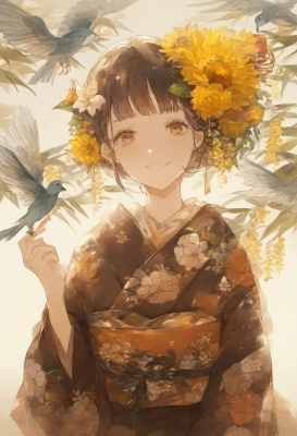 1girl,japanese girl,imono,smile,long eyelashes,flower hair ornament,black flowers,birds,sepia color,sumi-e,masterpiece,very aesthetic,extremely detailed,high resolution,perfect anatomy,, best quality, amazing quality, very aesthetic, absurdres