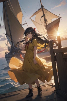 masterpiece, best quality, extremely detailed, anime, a girl, princess, young lady, beautiful girl, beautiful, victorious, tomboy, smile, be impressed, Latin, Spanish, dark eyes, dark skin, black hair, long hair, floating hair, (putting red ribbon on her hair), medieval, completely yellow dress, (completely yellow classic princess dress), (completely yellow flamenco Dress), long skirt, standing, wind is blowing, right hand on own right face, blue sky, sunrise, backlit, sea, medieval sailing ship, (big galleon ship), edge of ship, (broken mast), fallen mast, (on deck), many shipwrights,middle age, Age of Discovery,