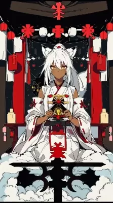 (masterpiece:1.2), (best quality:1.2), (novel illustration:1.1), (solo:1.2), brave female, (muscular female:0.4), (dark skinned:1.3) female, ((simple:1) Japanese miko:1.2), (fox ears:1.2), (white hair), small chest, ponytail hair BREAK extremely detailed, ruined shrine, destroyed shrine, cloud, tree flowers,