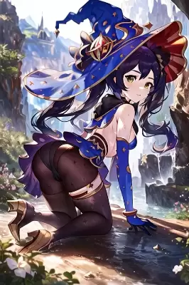 best quality,ultra-detailed, extremely detailed CG,beautiful , , (genshin),(mona:1.2),(genshin impact1.5),black hair,green eyes, long hair,light twin tails,black tights,small breasts,short girl,blue clothes, blue arm support ,witch hat,straight bangs,photorealistic, by famous artist, world masterpiece, full_body, view straight on,wet, flat chest, girl,woman,female, young,19 yearsold,sidelocks, Authentic and detailed face, small_breasts, bright skin, Gemological ornaments,choker, capelet, black_gloves, high_heels, collarbones,outdoors, landscape, an epic scene, Absurd,dynamic background, detailed background,wariza,amazing quality