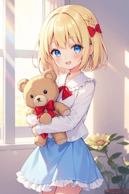 1girl, solo, blonde hair, short hair, blue eyes,loli, young, small build,(hair bow:1.4),red bow, (chibi:1.3),red ribbon in hair, happy expression, riding on a large white dog, gleeful, outdoors, grassy field, clear blue sky, daytime, sunlight, casual clothing, short dress, playful pose, dog looking happy, tail wagging, friendly atmosphere, nature background, flowers in field, light breeze, peaceful setting