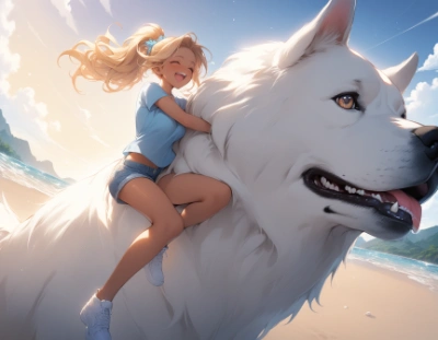 1girl, 1dog, Precise colored pencil drawing with very fine lines, Very smooth and delicate gradation, Illustration in anime style, a girl and a large white dog playing on a beach.The girl has long, wave-like blond hair in a ponytail, and the dog is jumping on her and licking her face. The girl is hugging the dog and smiling happily. The bright, vibrant colors express an intimate bond and affection. The scene has the movement and liveliness characteristic of animation., dynamic angle, dynamic pose, dramatic angle dramatic pose, fantasy, Slow motion, motion blur, (absurdres, masterpiece, best quality, super fine illustration), realistic, Ultra Detailed, Ultra Detailed background, beautiful detailed eyes and face, Vibrant colors, transparency, Colored pencil drawing of a figure. Beautifully detailed figures with vivid colors and fine line texture., Abnormally drawn, Very detailed beautifully and delicately face and eyes, Very precise and detailed costume and accessory textures, Beautiful hair as fine and supple as silken threads, ultra-detailed texture, (Dense and delicate gradation:1.2), beautiful landscape wide shot, 1girl and 1dog, very cute girls,blonde long wavy hair, shiny hair, shiny skin, blue eyes, tan skin, light freckles, Medium breast, Caucasian, high ponytail, blue t-shirt, denim shorts, White sneakers, laughing, happy, effervescent smile, open mouth, closed eyes, a huge white dog, ,,,,, <lora:flat2:-0.65> <lora:noline:0.65> <lora:hairdetailer:0.6> ,