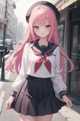 masterpiece, best quality, extremely detailed, anime, girl,<lora:flat2:0.55> <lora:hairdetailer:0> , bobcut, brown hair, purple eyes, (loli face:1.2),city,{jumping|leaning forward|hands on hips}, happy, miniskirt, cowboy shot,