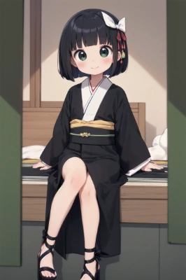 (((very longest hair))),black hair, smile,straight Hair,hair ribbon,mintgreen stripe,Black Eyes,flat chest,straight Across bangs,princess Cut, Very Long Sideburn,roundry Head,Droping eyes,cute,Meekness,Bob Cut,long back hair,12 years Old,kimono,cheeks, (((angry))),puff out your cheeks,