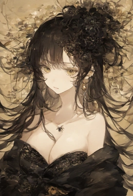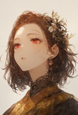 1girl,japanese girl,cool face, red eyes,long eyelashes,flower hair ornament,hands on own cheak,face focus,,sepia color,sumi-e,masterpiece,very aesthetic,extremely detailed,high resolution,perfect anatomy,, best quality, amazing quality, very aesthetic, absurdres