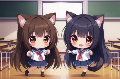 (masterpiece, top quality, best quality, official art, beautiful and aesthetic:1.2), (1girl, cute,chibi:1.3), extreme detailed, colorful, (high quality anime painting),ultimate shiny skin, detailed skin, ultimate detailed face, indoors, sitting chair, cat ears, black hair, super long hair, closed eyes, ribbon choker, school uniform, serafuku, pleated skirt, puffy cheek, eating cake, cup on table, smile, full body