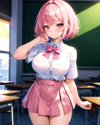 masterpiece, super fine illustration, best quality, light particles, ultra-detailed, 8K wallpaper, (a little girl), ((pink hair, bob cut)),big breasts,(cat kigurumi ),disheveled hair, medium hair, shiny hair, shiny skin, girl is soaked, (extremely beautiful pink eyes),