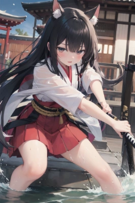 masterpiece, best quality, extremely detailed, anime, girl, <lora:flat2:0.25> <lora:eyecolle_viola_v100:1> , shrine maiden, sweating, mountain, sword fighting, black hair, wet hair, Japanese style,