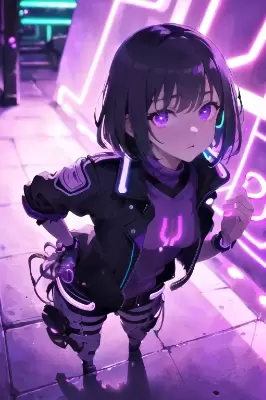 (masterpiece, best quality, ultra-detailed, best shadow):1.5, (beautiful detailed face, beautiful detailed eyes), 1 girl, a girl standing in a dimly lit alleyway, illuminated by vibrant (purple neon lights:1.5). The image creates a cool and edgy atmosphere, with the girl being a part of the vibrant and colorful city nightlife.
