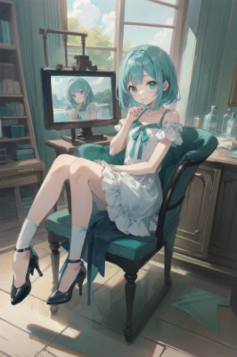 masterpiece, best quality, highres, 1otoko no ko, navy blue blazer, yellow cardigan, (brown pleated skirt), loafers, school bag, scarf, かわいい, flat chest, (aqua hair:1.2), aqua eyes, half updo, smile, friendship<lora:flat2:0> <lora:hairdetailer:0.5>,,