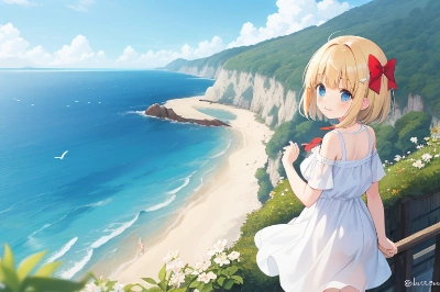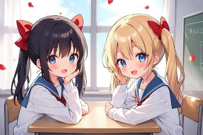 anime style, two girls, karaoke scene, golden-haired girl with short haircut, blue eyes,(hair bow:1.3), red ribbon on head, small black-haired girl, singing together, microphone in hand, vibrant karaoke room, colorful lights, joyous expressions, modern casual clothing, energetic pose, standing position, detailed facial features, prominent red ribbon, black hair described as sleek and shiny, age-appropriate features, dynamic background with musical notes, lively atmosphere, enthusiasm visible, (red ribbon:1.3), (karaoke room:1.1), (joyous expressions:1.2)