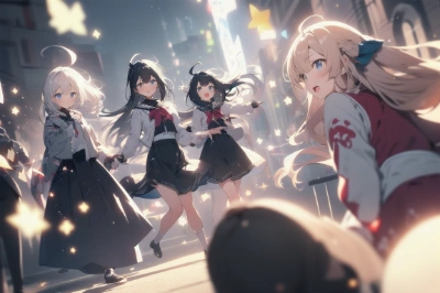 masterpiece, best quality, extremely detailed, anime, bokeh, motion lines, motion blur, blurry background, perspective, cinematic lighting, ,light particles, caustics,film grain, spectacular view, night view,black hair, blue eyes,rooftop, view, blushing, smiling,skyscraper, long sleeve <lora:gloweyes_v100:1> <lora:eyecolle_sumire_v100:0.95> ,