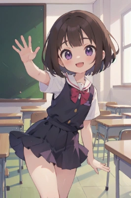 masterpiece, best quality, extremely detailed, anime, girl,<lora:flat2:0.55> <lora:hairdetailer:0> , bobcut, brown hair, purple eyes, (loli face:1.2),((medium breasts)),Placing hands behind head, nose blush,
