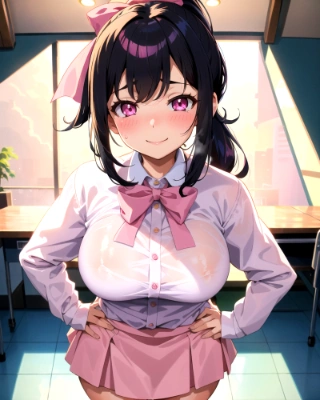 3 girls, big breasts, ((black hair)), disheveled hair, medium hair,ponytail, standing, shiny hair, shiny skin ,(white high school uniforms),(pink skirts),(burberry check panties),BREAK