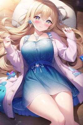 masterpiece, best quality, extremely detailed, anime, beautiful girl. lying glitter-eyes.diamondpupil. dress in (cute diamondcheked pattern print )cute cardigan uniform.diamond_accessory . ocean <lora:flat2:0.55> <lora:hairdetailer:0.05> ,