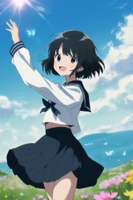 masterpiece, best quality, extremely detailed, anime, friends, girl, longhair, ponytail, short sleeve, maid uniform, blonde hair, silver hair, blue eyes, green eyes, maid, two people, colorful, cooking, cafe, summer, day, blue sky, panty shot, eating, standing, sitting, winking, laughing, smile, microskirt, greatbust,