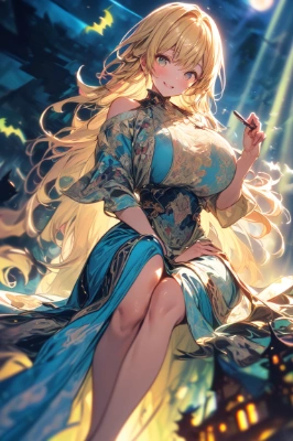 masterpiece, best quality, extremely detailed, (1girl, character focus, close to viewer:1.5), (brushwork of Alfons Mucha, Art nouveau:1.5), (airbrush painting, blurred, moonlight:1.4), (golden eyes, white tank top:1.9), (On a night when a huge red full moon shines, in the air overlooking the ancient castle, a beautiful lady with medium large breasts and a baby face is sitting on a group of bats:1.1), (happy smile and tears:1.4), (bat hair ornaments, hairclip, cleavage cutout, midriff peek, fishnet tigh highs, open jacket, long jacket, pleated mini skirt, golden blonde hair, swept bangs, high long ponytail, big droppy eyes:1.5), (waving, black jacket and skirt:0.5), energetic compositions, full figure, (dutch angle, abstract rays, dark abstract scatters:1.4), (motion blur, chromatic_aberration:1.4), (abstract background:0.8), <lora:flat2:-0.95> <lora:boldline:0.45> ,
