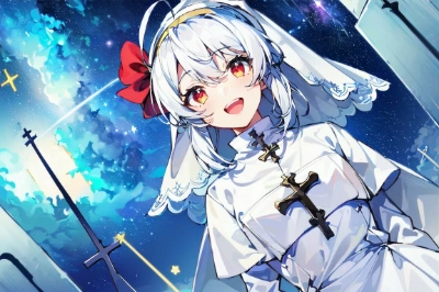 masterpiece, best quality, extremely detailed, (🌟🌠⛪👰:1.5),1 girl,white hair, smile open mouth, red eyes,hat,focus on upper body,(glow light:1.2), ,light particles,(dutch angle:1.3),ahoge, <lora:flat2:-0.45> <lora:hairdetailer:-0.35> ,,