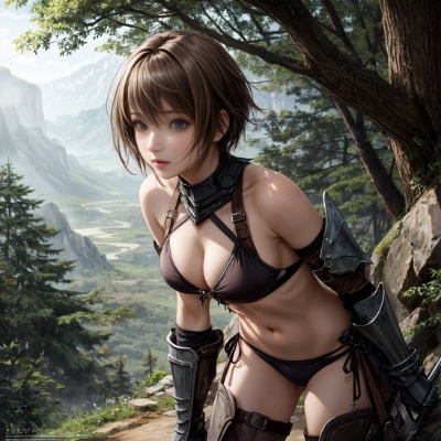 final fantasy xi,cinematic light,hyper detail, dramatic light,high resolution,best quality, masterpiece, best quality, ultra-detailed, illustration,(Airship:1.4), 1female, solo,Beautiful Eastern European female,extremely delicate and beautiful girls,intrepid face,(small eyes:1.2),25 years old,hdr,BREAK,(realistic:1.0),grey eyes,large breast,brown hair,short hair,swept bangs,adventure hunter,armor, bikini armour, gauntlets, boots,plating, protection, defense, offense, BREAK,battle, combat, fight,bowyer,action pose,dynamic angle,dagger in each hand, <lora:add_detail:1>