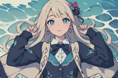 masterpiece, best quality, beautiful girl. glitter-eyes. diamondpupil. dress in (cute diamondcross pattern print )cute openeddown jacket .diamond_accessory . ocean .in ultimate quality absolutely detail maximum cute