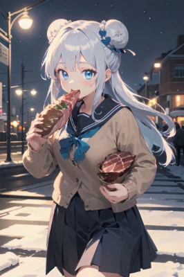 masterpiece, best quality, extremely detailed, anime, blue eyes, silver hair, Double buns, round face,medium breasts<lora:flat2:0.1> <lora:lightline:0.6>,school uniform, sailor suit, cardigan, night, winter, (eating (white steamed meet buns :1.2)), happy, walking, outside,pantyhose,,