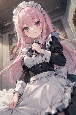 (((monocle))),(((wavy hair))),maid,long pink hair,masterpiece, best quality, extremely detailed, anime, smile,depth of field, dynamic angle, dutch angle ,(looking at viewer),in royal palace,from below,waving at the camera<lora:flatBG:-0.7> <lora:hairdetailer:1>,
