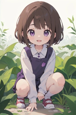 masterpiece, best quality, extremely detailed, anime, girl,<lora:flat2:0.55> <lora:hairdetailer:0> , bobcut, brown hair, purple eyes, (loli face:1.2),loli body, smile, {standing|jumping|crouching}, thighs, {from below|from front},