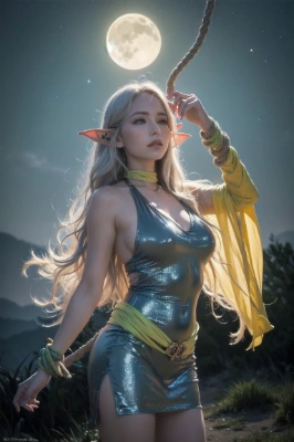 masterpiece, best quality, extremely detailed, anime(The bewitching older sister of the dark elf) (The bewitching older sister of the dark elf is rolling up and throwing snow in the snow) (brown skin/wheat-colored skin), maid, a pretty woman, twintail, garter belt, maid uniform, silver hair, yellow eyes, elf, goddess, fantasy, magic, snow, winter, night view, night sky, star, starry sky,