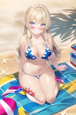 masterpiece, best quality, extremely detailed, anime, <lora:flat2:-0.85> <lora:hairdetailer:0.8> beautiful girl.sitting glitter-eyes.powderpupil. in (cute powder_pattern print )cute bekini .powder_accessory . beach.powdereffect,