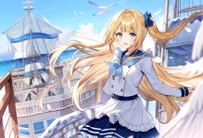 very aesthetic, best quality, absurdres, masterpiece, best quality, sailing ship, {{{2girls on sailing ship deck}}}, birds, Ruffled trim and frill sleeves, hair ornament, {{{blue sky}}}, official art, with blush cheeks, official art, {{ultra-detailed}}, {{high resolution}}, dynamic fuzziness, colorful, best quality, cowboy shot, underwear, girl ,solo, 20 years old, beautiful detailed hair, beautiful detailed eyes, blunt bangs, braid hair, twintail, side ponytail, bob, Shostakovich, hypermaximalist, super detailed,