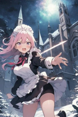 masterpiece, best quality, extremely detailed, anime, girl, longskirt, maid, girl, longhair, maid uniform, garter belt, silver hair, odd eyes, wizard, fantasy, magic, monster, sunset, evening sun, castle, ruins, different world, angry, running, jumping, flying, punching, shooting, greatbust,