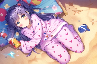 masterpiece, best quality, extremely detailed, anime, beautiful girl.lying glitter-eyes.powderpupil. in (cute powder_pattern print )cute pajama .powder_accessory . beach.powdereffect <lora:flat2:0.4> <lora:hairdetailer:-0.5> ,