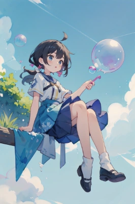 masterpiece, best quality, extremely detailed, anime, girl, skirt <lora:lightline:1> <lora:saturation:1> , Soap bubble, star, space, playing, sitting, flying,