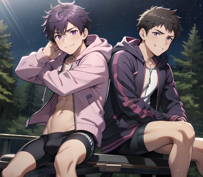 masterpiece, best quality, highres, <lora:128dimTurbomaleV7_128:0.3>, <lora:shiroann_style:0.5>, 3boys, (huge pectorals:1.2), <lora:Hyper Pecs v2:0.3>, outdoors, park, (night:1.2), short hair, (hair over one eye:1.3), <lora:hair_over_eyes:1>, yellow Hair, blue eyes, openmouth, (tongue out:1.2), forced smile, (hooded jacket:1.2), (bike shorts:1.3), sunglasses,goggles, yaoi, (bulge, sweat:1.4), (saliva, kiss:1.3), open mouth, heavy breathing, <lora:AnimeKissLoCon:0.4> , <lora:Arashi_Gatchimori_V1:0.25>