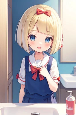 1girl, short blonde hair, blue eyes, red ribbons on both sides of head, (hair bow:1.4),red bow,wearing blue sailor style school uniform, white socks, black shoes, holding bubble wand in right hand, blowing bubbles, left hand raised, standing on grass, park background, trees, slides, swings, clear blue sky, bubbles floating up into sky, covering air, sparkling in sunlight, detailed bubbles, spheres, reflections, rainbow colors, translucent, delicate, girl smiling joyfully, eyes closed happily, taking delight in bubbles floating up freely, wind gently carrying bubbles higher (wind: 0.8), warm sunshine (warm sunlight: 1.0), innocence of childhood (joy: 1.2)