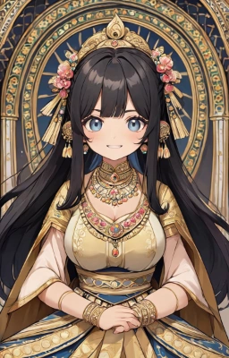 masterpiece, best quality, extremely detailed, anime, girl, ponytail, longhair, loli, twintail,(Saree costume:1.5),long skirt,black hair, blue eyes,skin fang,large breasts,thick eyebrows,sisters, older sister, younger sister,in the India,