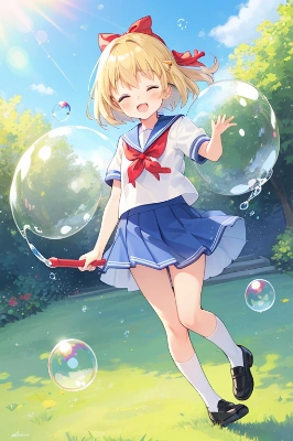 1girl, short blonde hair, blue eyes, (hair bow:1.3),(red bow:1),red ribbons on both sides of head, smiling happily, standing, facing forward, looking at other girl, very detailed face, eyes, hair, skin.