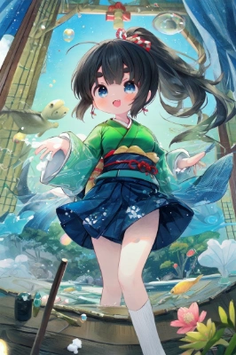 masterpiece, best quality, extremely detailed, anime, (((((Soap bubble))))),(((fisheye))),((floating hair)), girl, ponytail, longhair, loli,saree,black hair, blue eyes,skin fang,large breasts,((thick eyebrows)),sisters, skirt, long sleeve, shrine maiden, Japanese style, fantasy, surprise, <lora:hairdetailer:1> <lora:saturation:1> ,