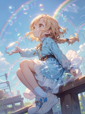 (masterpiece, best quality, elaborately crafted costumes, rich in details and textures, perfect anatomy, beautiful eyes, beautiful hands, anime:1.25), depth of field, beautiful landscape wide shot, cowboy shot, cinematic lighting, from side, beautiful solo loli, outdoor, (day time, blue sky, beautiful rainbow in the sky, soap bubbles flying in the sky, looking away, looking up the sky,:1.6), (the loli is 8 yo, middle hair, single braid, blond hair, pale brown eyes, cheerful, happy:1.25), the loli wearing that long sleeve child blouse, (denim skirt:1.6), white socks, beautiful sneakers