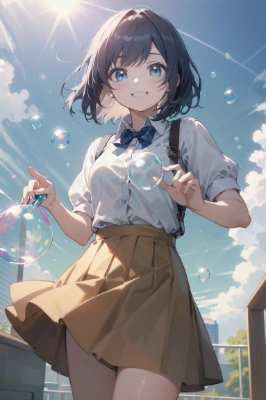 <lora:flat2:0> <lora:hairdetailer:0.5>, masterpiece, best quality, extremely detailed, beautiful detailed glow, ultra high res, beautiful, best aesthetic, 8k, anime, a pretty woman, longhair, blonde hair, pink eyes, ((medium breasts)),bikini, thighs, smile, ((Soap bubbles)), hands up, pool side, night,