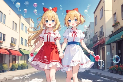 loli,blonde hair, short hair, hair bow,red bow,blue eyes,school swimsuit,smile,standing,(black one-piece swimsuit1.3),bubble, (soap bubbles:1.4), poolside, summer,