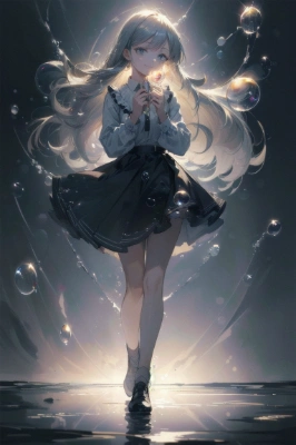 (masterpiece,) (best quality), (extremely detailed),ultra high detailed,raw photo,beautiful girl,closed mouth smile,detailed hands,breakblouse,skirt,breakfull body,black background,darkness,(shining lighting bubbles:1.5),many bubbles, <lora:hairdetailer:0.75> <lora:eyecolle_salvia_v100:1> ,,,,