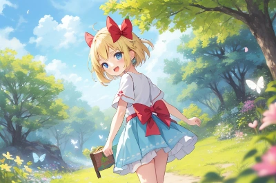1girl, short blonde hair, blue eyes, red hair ribbon,(hair bow:1.4),red bow, looking forward, leaf in front, praying mantis on leaf, detailed green leaf, detailed praying mantis, gazing each other, gold eyes, green body, cute girl, (girl face:1.2)(leaf:0.9)(mantis:1.1), Japanese anime style, standing, forest background, (background: 0.5)