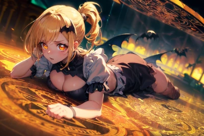 masterpiece, best quality, extremely detailed, (Fauvisme art:1.5), (hyperrealistic, blurred, dramatic lighting:1.4), (golden eyes:1.7), (the girl dancing with Fierce Flames, fire storm, laugh, miko outfit:1.6), (bat hair ornaments, hairclip, cleavage, tigh highs, golden blonde hair, swept bangs, high long ponytail, big droppy eyes:1.5), (Magic Circle:1.5), (energetic compositions, wide shot, full figure, dutch angle:1.2), (abstract rays, dark abstract scatters:1.4), (motion blur, chromatic_aberration:1.4), (foreshortening, abstract background:0.8), (fisheye distorted lens:0.9), <lora:flat2:-0.95> <lora:boldline:-1> ,