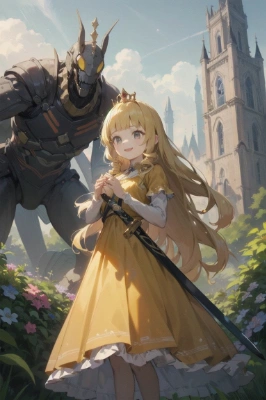 masterpiece, best quality, extremely detailed, anime, a girl, princess, young lady, beautiful girl, beautiful, victorious, tomboy, smile, happy, be impressed, dark eyes, blonde hair, long hair, hime cut, spiral curl hair, blunt bangs, completely yellow dress, yellow classic princess dress, tiara, holding a giant sword, standing, flower garden, medieval castle, (translucent giant praying mantis) , middle age, fantasy,