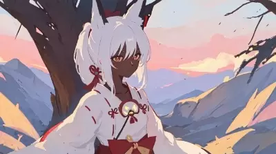 (masterpiece:1.2), (best quality:1.2), (novel illustration:1.1), (solo:1.2), (dark skinned:1.3) girl, ((simple:1) Japanese miko:1.2), (fox ears:1.2), (white hair), small chest, ponytail hair BREAK extremely detailed, sakura, cloud, trees, clamming, <lora:minimalistAnimeStyle_v10:0.5>