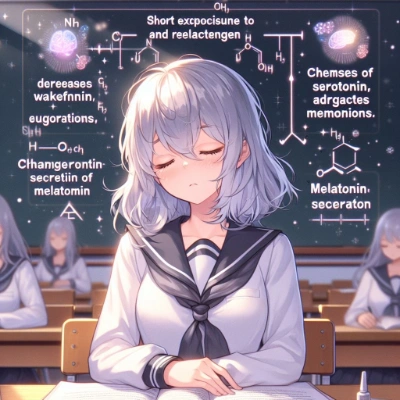 【お題】 冬眠 Falling asleep during \"Lecture on why we get sleepy in winter\" プロンプト 化学の授業中に居眠りをする銀髪高校生の美しいアニメ調イラスト、日の光を浴びる時間が短いと覚醒を促進したり、感情を調節したりするセロトニンが減少し、脳の機能が低下します。 また、睡眠を調節しているメラトニンの分泌量が変化して体内時計を狂わせます。 このように、冬になるとセロトニン・メラトニンの分泌量のバランスが悪くなるため、眠気を感じやすくなる、 Bing Image Creatorで生成