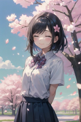 masterpiece, best quality, extremely detailed,ultra high res,(detailed:1.8),cute girl,school uniform with bowtie,closed eyes smile,arms behind back,(Cherry blossom trees park),(long shot1.5),(petals:1.5),wind,blue sky,against the tree, <lora:hairdetailer:0.7> <lora:eyecolle_salvia_v100:1> ,,