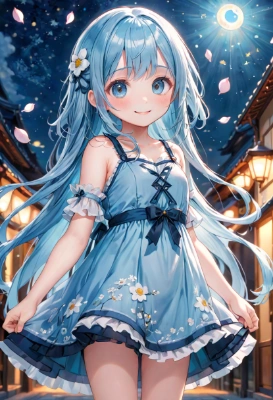 masterpiece, best quality, extremely detailed, (illustration, official art:1.1), 1 girl,(((( light blue long hair)))), light blue hair,10 years old, long hair ((blush)), cute face, big eyes, entice foot, (((full body))), masterpiece, best quality,(((((a very delicate and beautiful girl))))), Amazing, beautiful detailed eyes, blunt bangs((((little delicate girl)))), three(true beautiful:1.2), seductive smile, sense of depth, dynamic angle, <lora:hairdetailer:0.6> (show off own areola slip:1.2)affectionate smile,(tiny 1girl model:1.2), lights, night, starry sky with petals,,